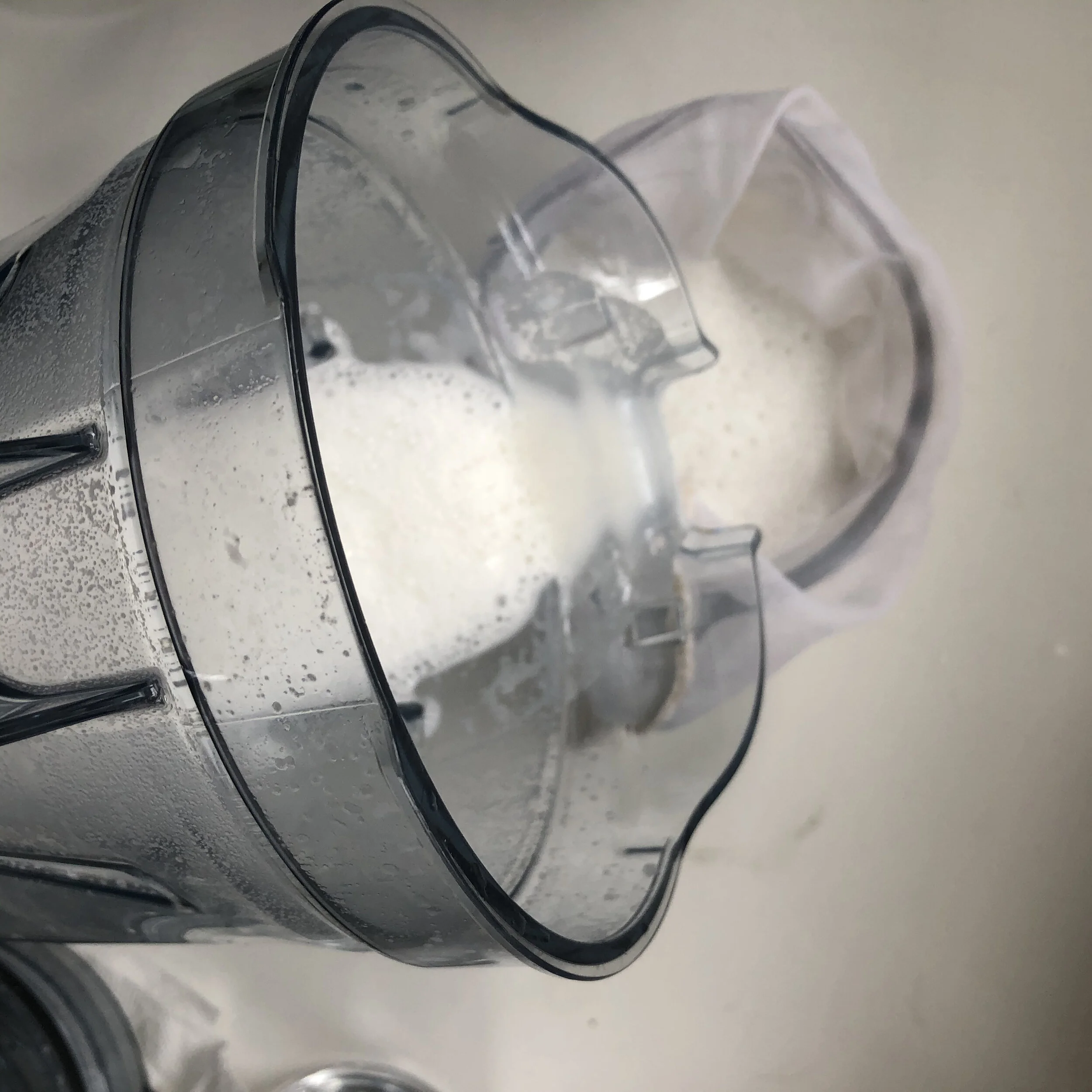 4. Line a glass container or a jar with a nut milk bag and strain the content of your blender. Make sure to squeeze every drop.